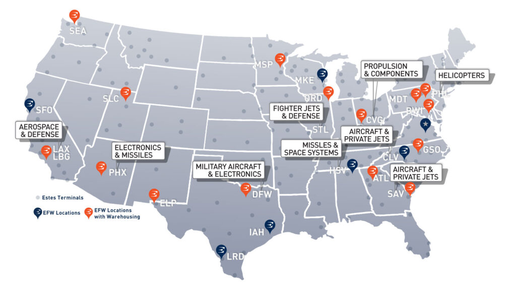 EFW operates near major aerospace and defense centers for faster access to critical facilities and reduced transit times for time-sensitive shipments.