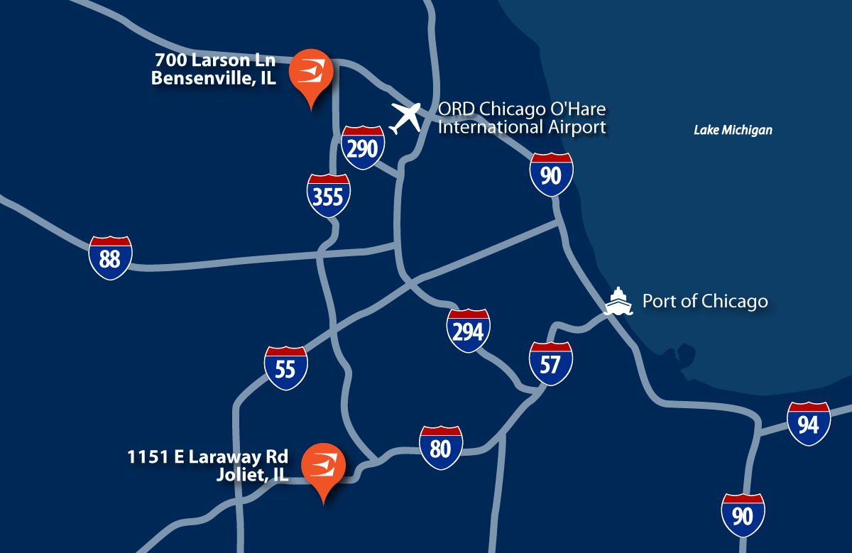 EFW’s Chicago warehousing network offers over 442,000 sq. ft. of directly managed, C-TPAT compliant space across two strategic locations. We provide secure storage, distribution, and scalable support for domestic and international freight.