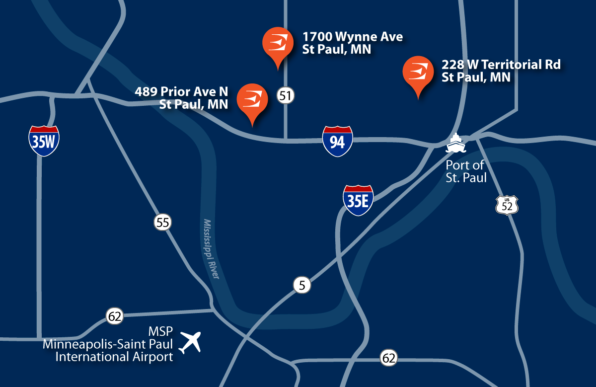 EFW’s Minneapolis/St. Paul operations offer more than 677,000 sq. ft. across three strategically located facilities, supporting high-volume distribution across Minnesota, the Twin Cities region, and the broader Upper Midwest. With easy access to MSP International Airport and the Port of St. Paul — the northernmost port on the Mississippi River — these locations are well-positioned to support medical device manufacturers, retail brands, and organizations managing complex national and global supply chains.